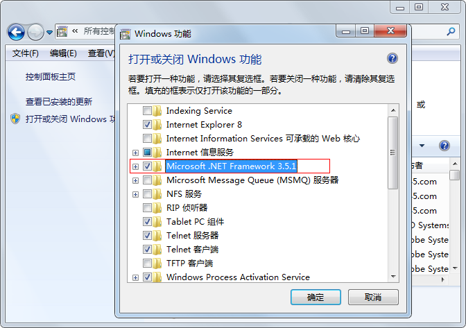 然后在打開的“Windows功能”窗口中查看“.NET Framework 3.5(包括.NET 2.0和3.0)”,如果已經(jīng)被選中,則證明已經(jīng)安裝成功。如圖: