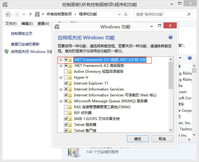 查看“.NET Framework 3.5(包括.NET 2.0 和 3.0)”有否被選中,若沒有,點擊勾上,確認(rèn)安裝就即可安裝。