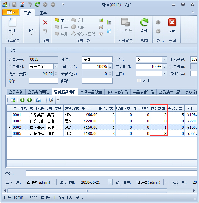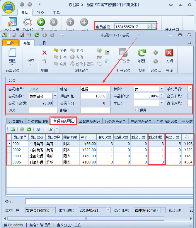 汽車美容店的會(huì)員到店消費(fèi)已購買的套餐服務(wù),店員根據(jù)會(huì)員提供提供的電話號(hào)碼或姓名,在傲藍(lán)汽車美容軟件的搜索欄中快速搜索出會(huì)員資料,查看會(huì)員資料中剩余可以用的套餐服務(wù)次數(shù),如圖: