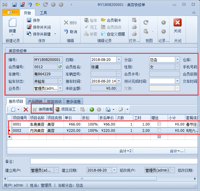 ②為會(huì)員開完美容快修單并使用套餐內(nèi)的服務(wù),軟件將自動(dòng)扣減服務(wù)數(shù)量,如圖:
