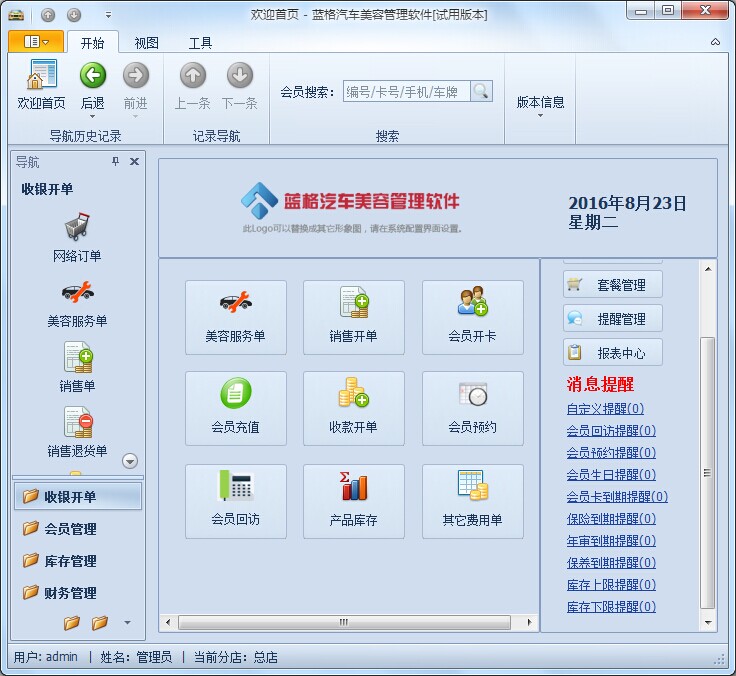 3. 由于每個用戶只屬于一個汽車美容店。所以操作用戶登錄后,也就知道是登錄哪個汽車美容鋪了。如下圖狀態(tài)欄顯示的當前汽車美容店鋪的名字。在歡迎界面中可以看到