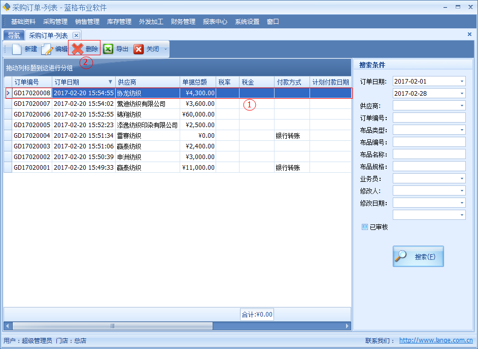 如需要對(duì)采購(gòu)訂單中某一條數(shù)據(jù)進(jìn)行刪除的,通過采購(gòu)訂單列表選中一條記錄點(diǎn)擊【刪除】按鈕,刪