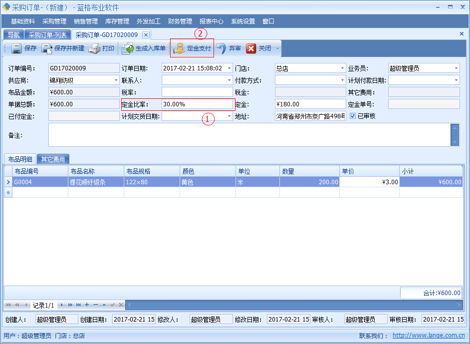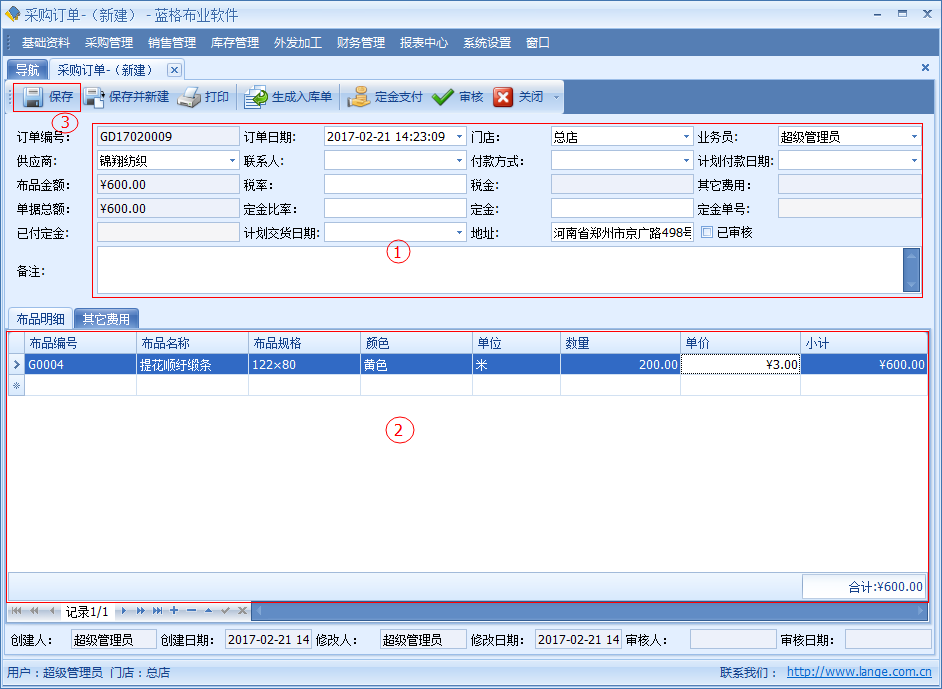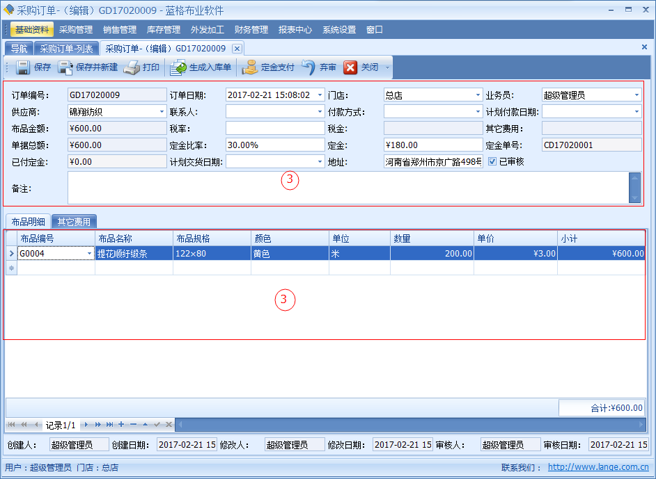 【采購(gòu)訂單】中記錄了開單日期、供應(yīng)商、供應(yīng)商聯(lián)系人、交貨日期、付款日期、付款方式、金額、定金、稅率、稅金等信息。明細(xì)數(shù)據(jù)中是該單據(jù)采購(gòu)布品名稱,顏色,單位,數(shù)量?jī)r(jià)格等詳細(xì)數(shù)據(jù)。