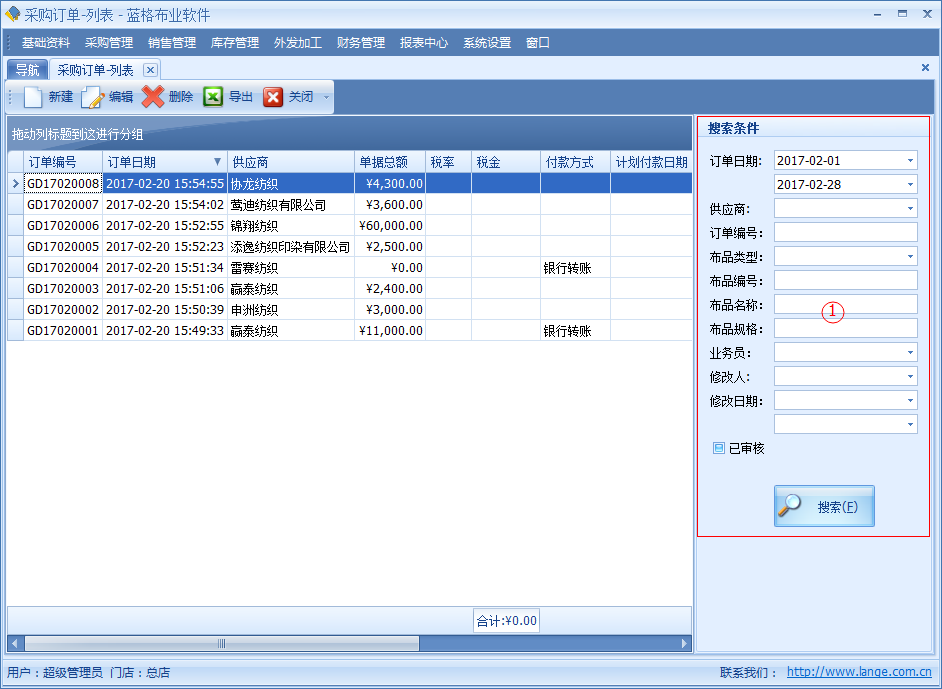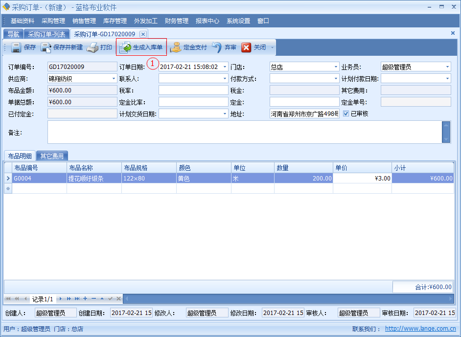 傲藍(lán)布行管理系統(tǒng)采購(gòu)訂單管理,采購(gòu)訂單主要是用于,采購(gòu)時(shí)按照所需要的布品,進(jìn)行登記。