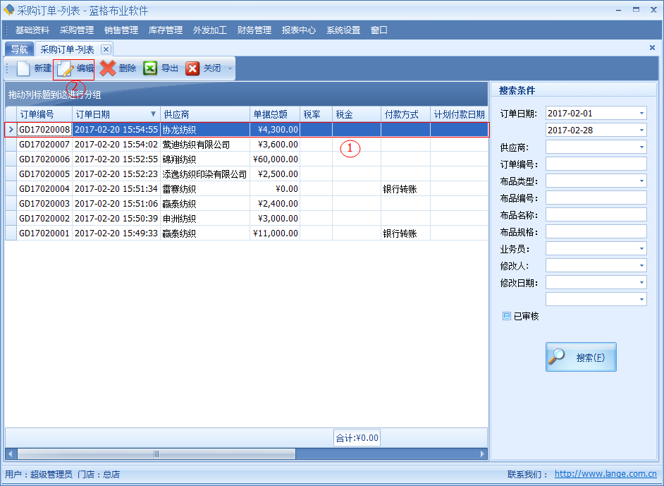 ○1 通過訂單編號(hào)或者供應(yīng)商,布品名稱等方式快速查詢數(shù)據(jù)。 如下圖: