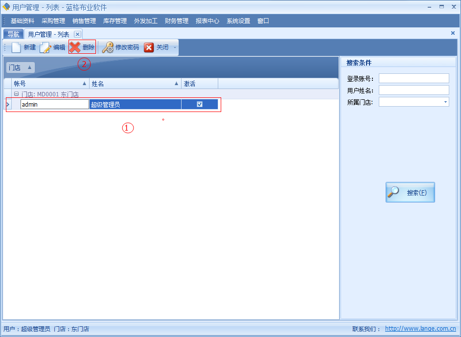 如需要對(duì)用戶(hù)進(jìn)行刪除的,通過(guò)用戶(hù)管理列表界面,選中一條記錄。點(diǎn)擊【刪除】按鈕,刪除即可。