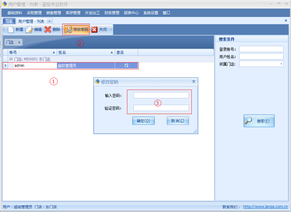 如需要對(duì)用戶(hù)進(jìn)行修改密碼的,通過(guò)用戶(hù)管理列表界面,選中一條記錄。點(diǎn)擊【更改密碼】按鈕,在