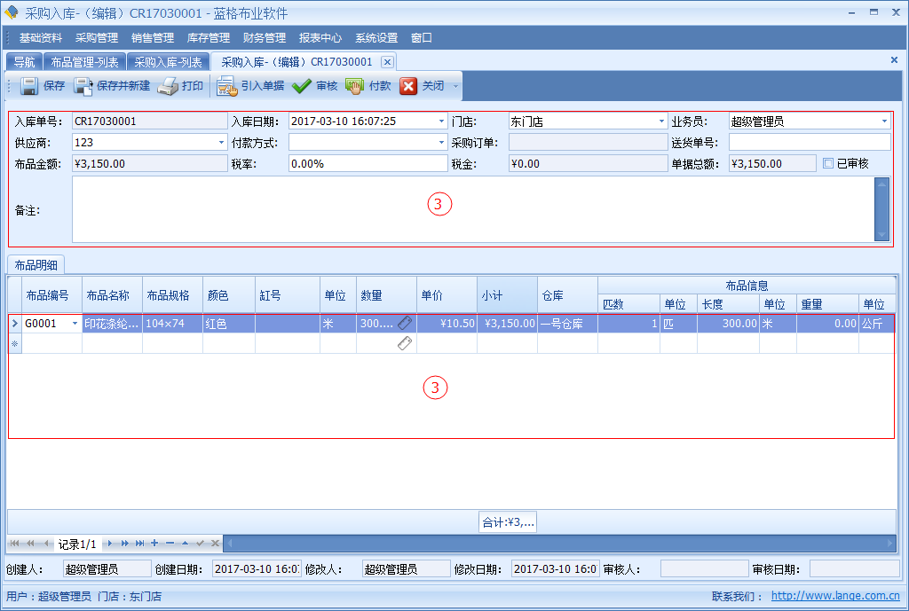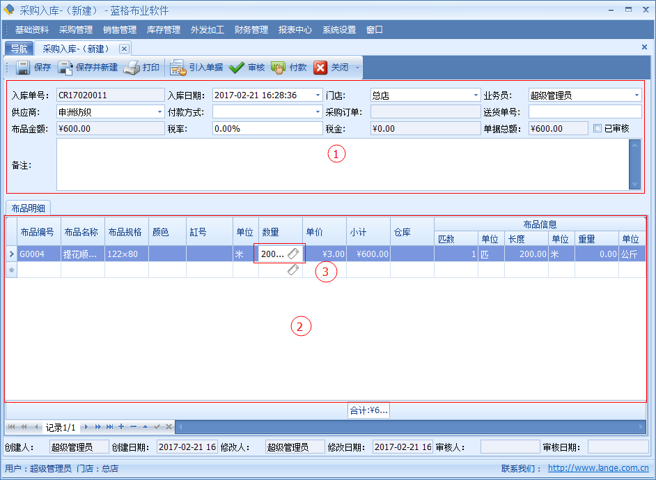 傲藍布行管理系統(tǒng),主要是對采購回來的布品,進行錄入入庫。【采購入庫】單具體中記錄了采購布匹的單據(jù)日期、引用采購單據(jù)編號、供應(yīng)商、送貨單、入庫的倉庫、單據(jù)總金額、稅率、稅金等信息。明細(xì)列表中包括單據(jù)采購布品名稱,顏色,單位,數(shù)量價格等詳細(xì)數(shù)據(jù)。