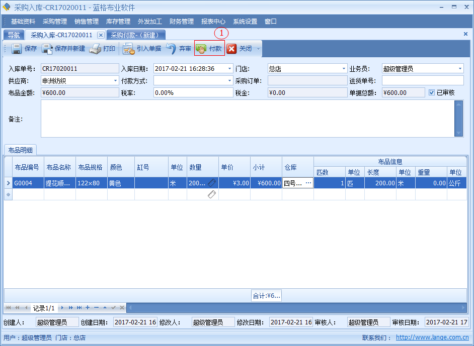 如需要為當(dāng)前入庫單進行付款,具體步驟如下圖;