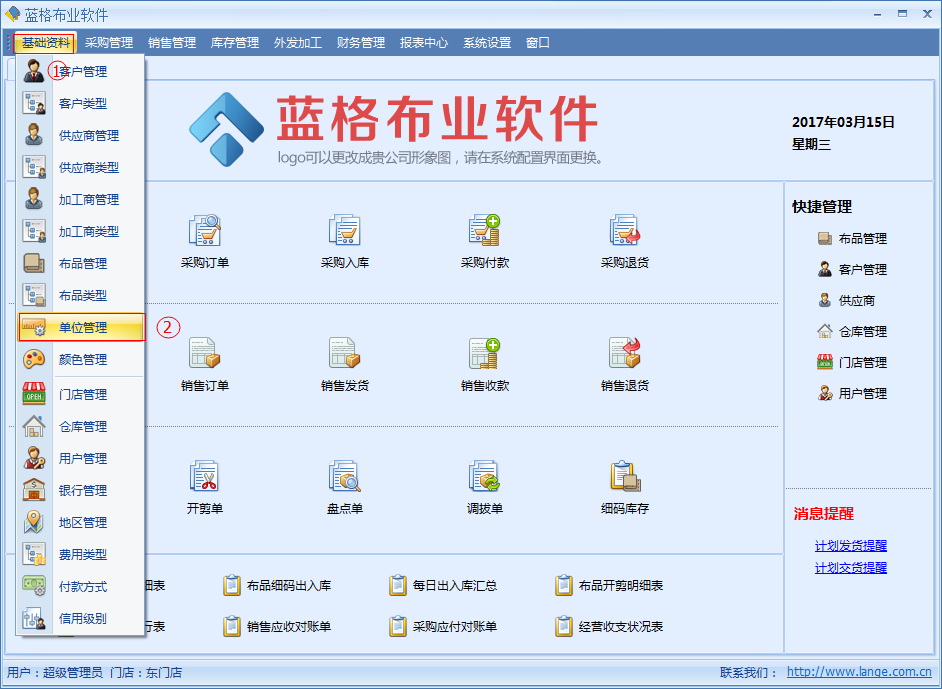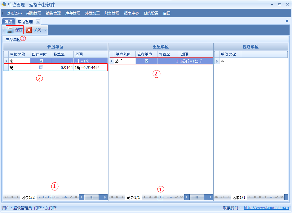 傲藍(lán)布業(yè)銷售軟件,單位管理分長度單位,重量單位,匹卷單位。單位管理是是布品信息里的一個(gè)字段信息,每一個(gè)布品信息只可以選擇一個(gè)單位,單位的內(nèi)容包括:單位名稱、是否是庫存單位、單位比率。