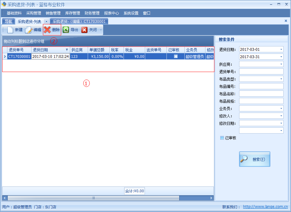 如需要對采購退貨中某一條數(shù)據(jù)進行刪除的,通過采購退貨列表選中一條記錄點擊【刪除】按鈕,刪