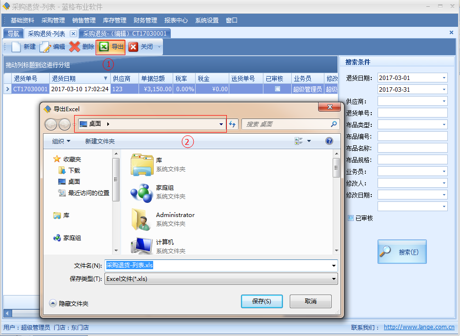導出是把當前列表中所有的記錄以 Excel 表格方式導出。在采購退貨列表上點擊工具欄【導出】按鈕。