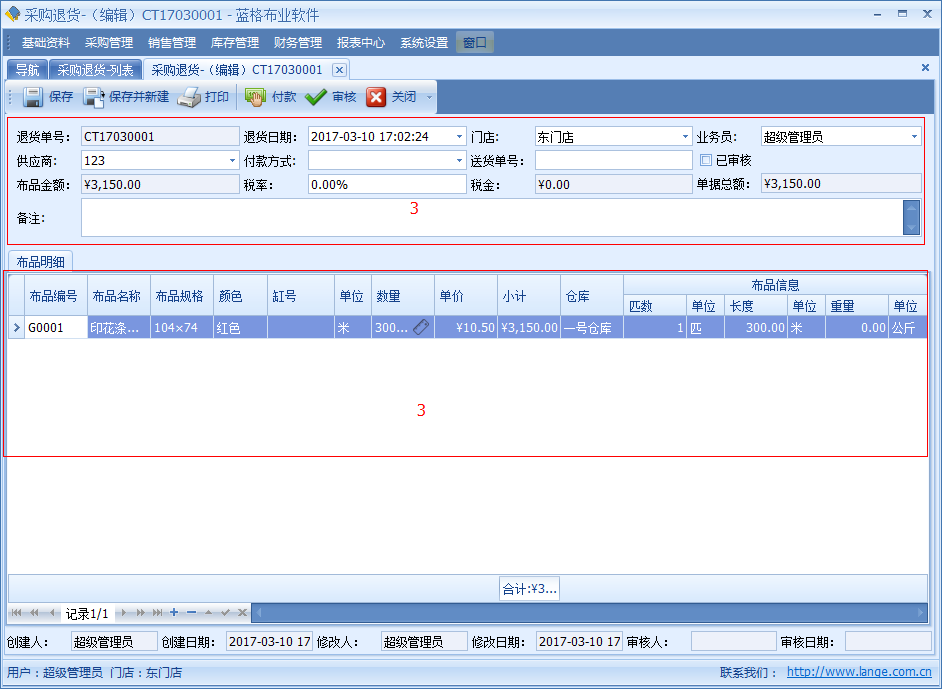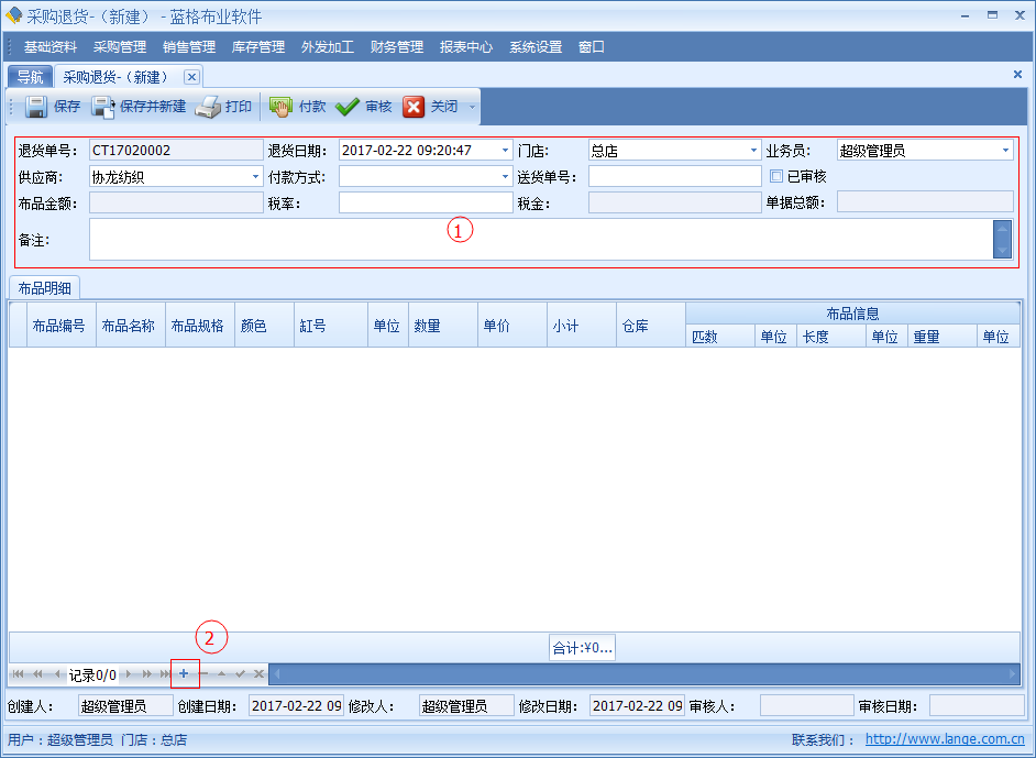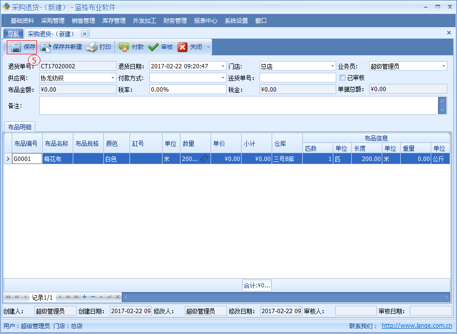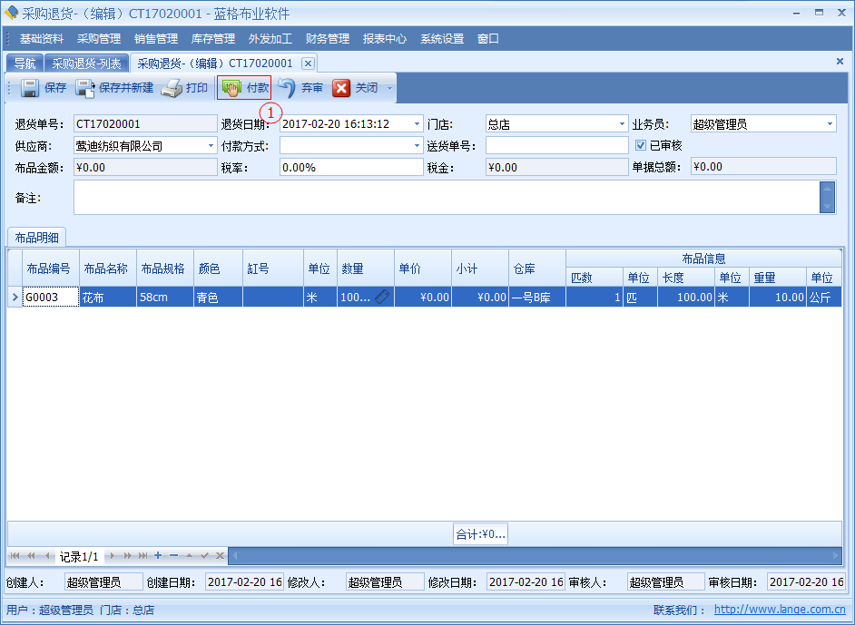 當采購布品回來時發(fā)現(xiàn),布品中有破損、布品不對或者其他情況需要退貨給供應(yīng)商,并且取回來已經(jīng)支付給供應(yīng)商的布匹款項。傲藍好布業(yè)軟件中可以通過【采購退貨】來操作。采購退貨單據(jù)包括退貨日期、要退貨的采購單、供應(yīng)商、倉庫、金額等信息。明細列表中包括單據(jù)要退貨的布品名稱、顏色、單位、數(shù)量、明細碼價格等詳細數(shù)據(jù)。
