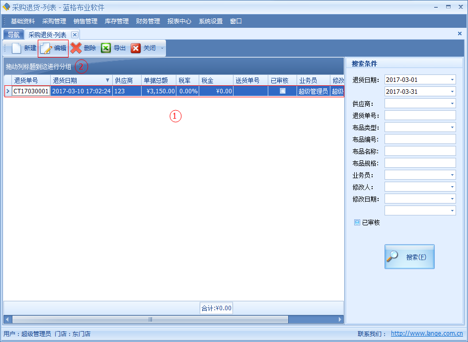 如需要對采購退貨某一條數(shù)據(jù)進行修改的,通過采購退貨列表選中一條記錄點擊【編輯】按鈕,進入