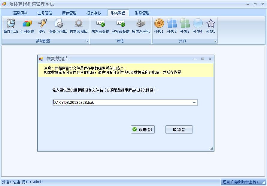 電腦在使用過程由于中病毒或者系統(tǒng)崩潰造成數(shù)據(jù)丟失,傲藍鞋帽銷售管理軟件提供了數(shù)據(jù)恢復(fù)功能,數(shù)據(jù)可以隨時恢復(fù)。下面介紹數(shù)據(jù)的恢復(fù)操作 登錄傲藍鞋帽銷售管理軟件后在【系統(tǒng)配置】導(dǎo)航點擊【恢復(fù)數(shù)據(jù)庫】,在彈出的恢復(fù)數(shù)據(jù)庫界面中選擇以前備份的數(shù)據(jù)庫文件,然后點擊“確定”,這樣就恢復(fù)數(shù)據(jù)庫了,如下圖: