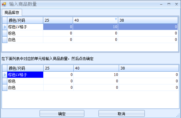 在上圖中雙擊商品,打開輸入商品數(shù)量界面,該界面?zhèn)€表顯示的是當前該商品庫存的數(shù)量,第二個表在相應的單元格中輸入采購商品的數(shù)量。輸入完成后點擊【確定】,該商品的信息就保存到界面。
