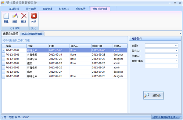 點擊【業(yè)務管理】->【商品采購】, 打開商品采購列表界面,該界面可以進行查詢,查詢相關的商品采購單信息,雙擊該采購單據(jù)打開商品采購單據(jù)詳細信息界面。該界面包括編輯商品采購單,刪除商品采購單和建立新的商品采購三個功能。如下圖: