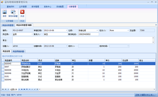 在上圖中點擊【新建】打開商品采購單編輯界面。填寫好采購單相關的信息。然后點擊【保存】這樣就把采購單錄入到系統(tǒng)中。當在上圖中選擇一個采購單點擊【編輯】,在該界面中會顯示選擇采購單詳細的信息,修改其中的項目,然后點擊【保存】,采購單的信息就更新完成。