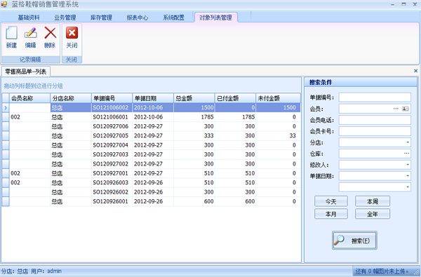 點擊【業(yè)務(wù)管理】->【零售列表】, 打開零售單據(jù)列表界面,該界面可以進(jìn)行查詢,查詢相關(guān)零售單的信息,雙擊該單據(jù)打開零售詳細(xì)信息界面。零售單據(jù)列表界面包括編輯零售單,刪除單據(jù)和建立新的單據(jù)三個功能。如下圖: