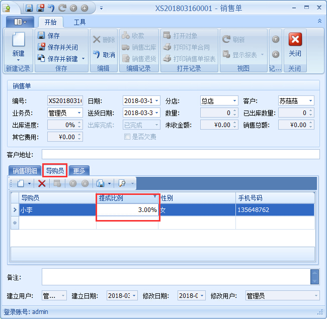 1、在銷售開單的同時(shí),可以在銷售單上選擇相應(yīng)的導(dǎo)購(gòu)員,并設(shè)置業(yè)績(jī)提成比例,提成比例設(shè)置完成,系統(tǒng)將自動(dòng)計(jì)算員工總的業(yè)績(jī)提成,如圖: