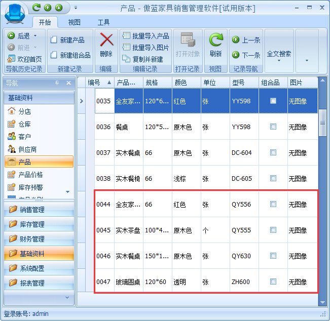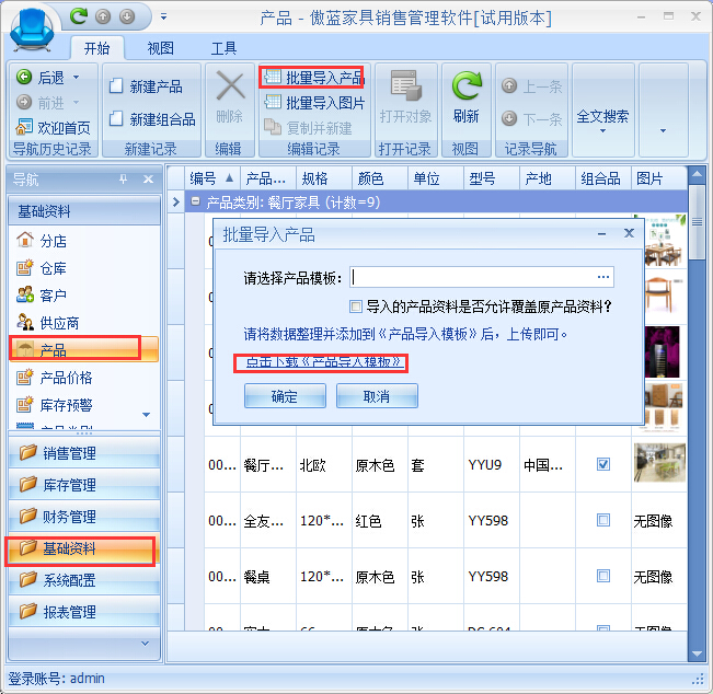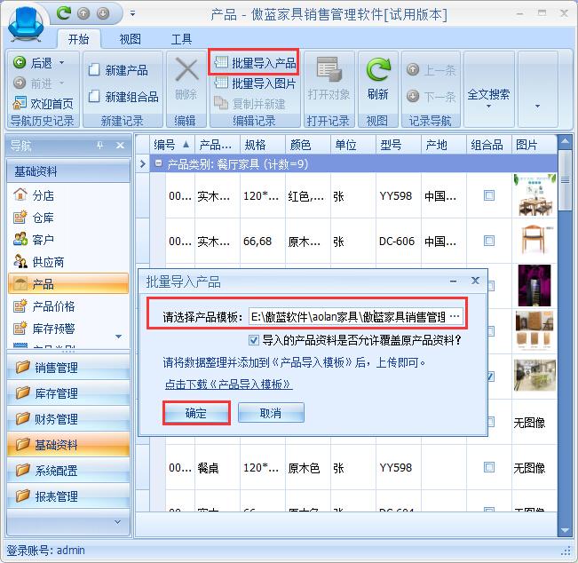 ⑤導(dǎo)入完成之后,傲藍(lán)家具店鋪收銀系統(tǒng)就會(huì)在產(chǎn)品資料中新增導(dǎo)入的產(chǎn)品,如圖: