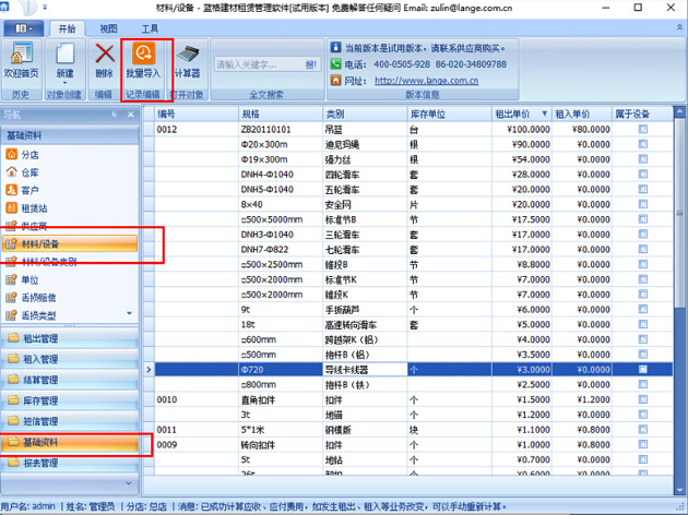 傲藍(lán)建筑租賃管理軟件可以從模板批量導(dǎo)入材料/設(shè)備的數(shù)據(jù),節(jié)省了客戶在剛試用軟件必須去一個(gè)個(gè)建立基礎(chǔ)資料的時(shí)間。