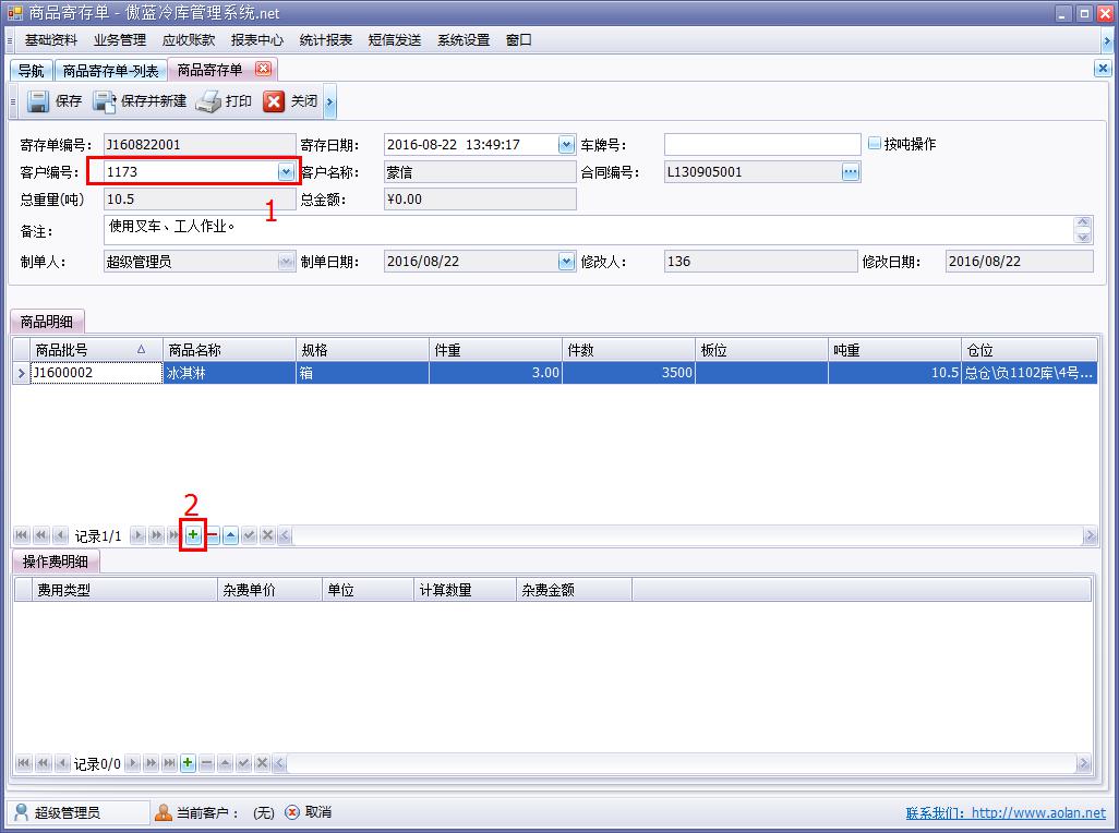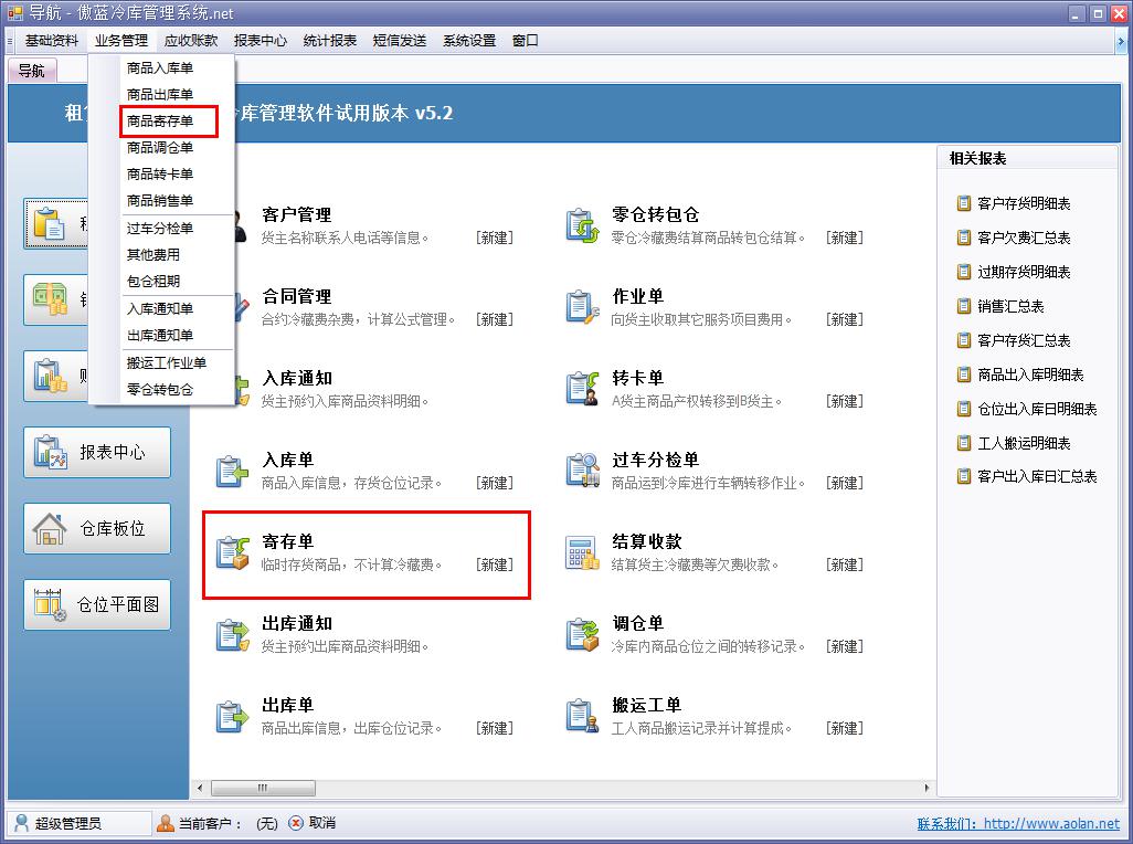 傲藍(lán)冷庫倉儲管理軟件寄存模塊即商品寄存單,界面與商品入庫單相似,冷庫倉儲管理軟件可分倉庫,按照商品批號或者商品編號進(jìn)行入庫寄存。