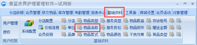 1、打開傲藍皮具護理店管理軟件點擊導航欄的【基礎(chǔ)資料】→【物品名稱】如圖: