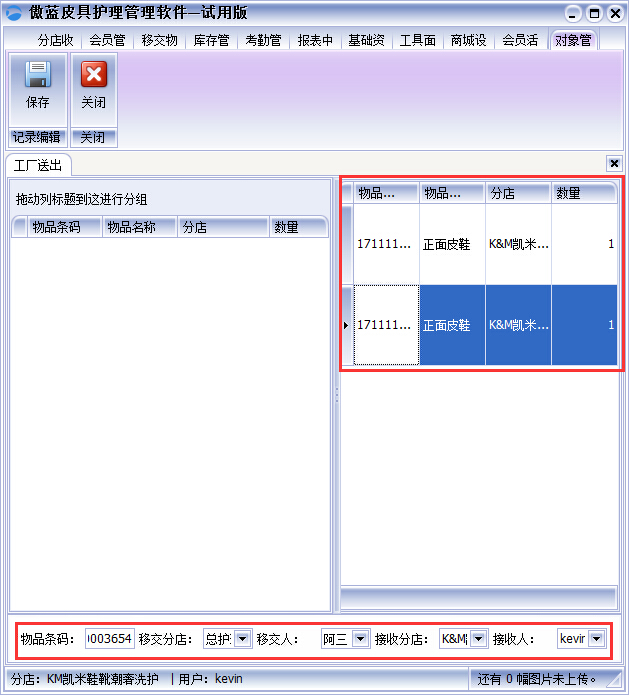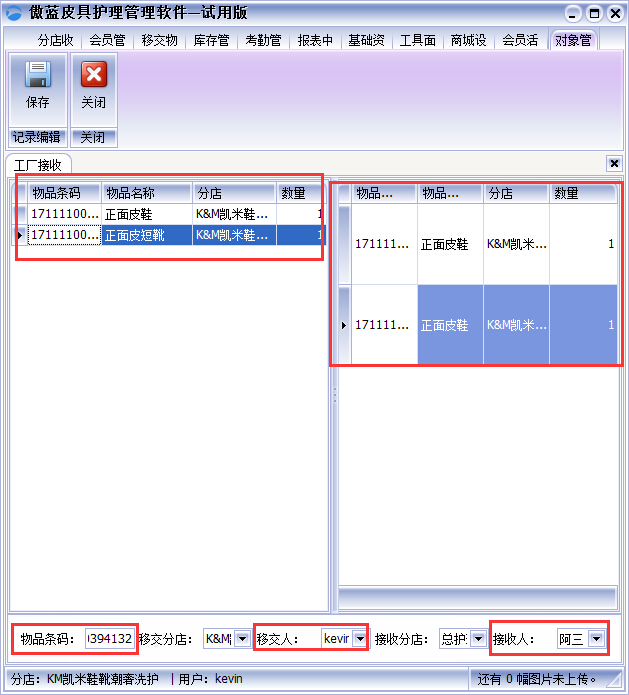 ①工廠接收”工廠接收到門店送來的皮革物品,在軟件“工廠接收”界面,掃描皮革物品的條碼進(jìn)行接收皮革物品,通過傲藍(lán)皮具修理店收銀軟件左右兩個列表,可以很清晰的看出哪些皮革物品接收,哪些皮革物品未接收或漏接收,確認(rèn)好接收人,保存即可,如圖: