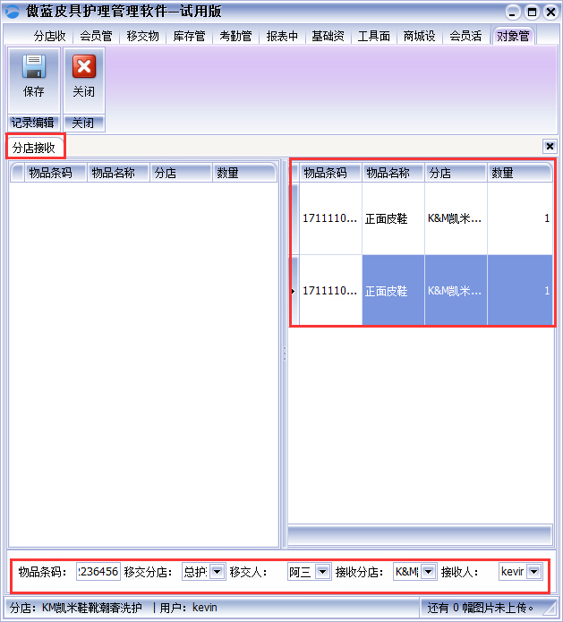 ③“分店接收”操作如上。傲藍(lán)皮革護(hù)理店管理軟件整個皮革物品移交流程,無需人工清點,提高皮革護(hù)理店工作效率,還有效的避免了多次移交可能出現(xiàn)的皮革物品丟失或錯送、漏送的情況,如圖:
