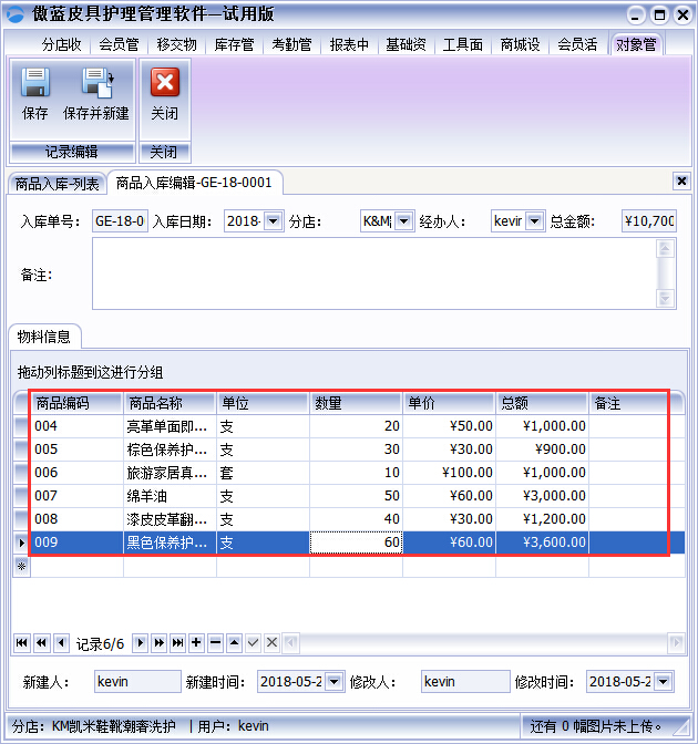 2、產(chǎn)品資料建立完成,商品采購之后,需要將商品入庫管理,點擊【庫存管理】→【商品入庫】→新建商品入庫單,選擇本次入庫的商品,采購數(shù)量保存即可,商品庫存數(shù)量自動增加,如圖: