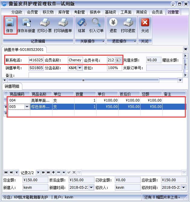 3、當(dāng)商品要進行銷售時,在傲藍皮具護理店管理系統(tǒng)的【分店收銀】→【銷售開單】進行銷售產(chǎn)品,填入會員或散客的電話,選擇需要銷售的產(chǎn)品,購買的數(shù)量保存,結(jié)算并打印收銀單據(jù)即可,如圖: