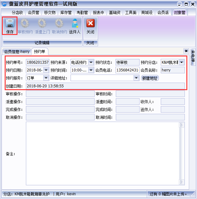 在彈出的會(huì)員信息界面,可以新建預(yù)約單,進(jìn)入預(yù)約單詳細(xì)界面,人工輸入預(yù)約基礎(chǔ)信息與項(xiàng)目,點(diǎn)擊“保存”即可完成預(yù)約單,預(yù)約審核與派遣上門的操作,如圖: