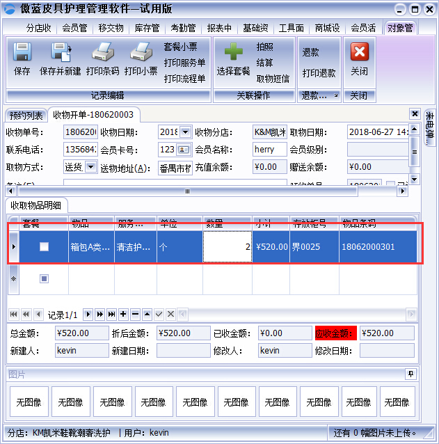 錄入相關(guān)的需要護(hù)理保養(yǎng)的皮革信息保存就可以完成該會(huì)員的收物開單,如圖: