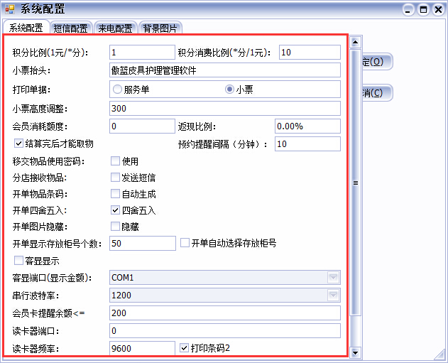 傲藍(lán)皮具護(hù)理店管理軟件可以一次性設(shè)置軟件后續(xù)進(jìn)行的各項(xiàng)會(huì)員消費(fèi)積分兌換系數(shù),以及小票抬頭,短信的設(shè)置或者客戶來電配置。一次性設(shè)置后續(xù)使用軟件就可以用在業(yè)務(wù)流程上,方便護(hù)理店快速完成各項(xiàng)業(yè)務(wù),提高運(yùn)作效率。