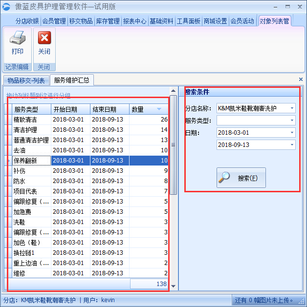 傲藍皮革養(yǎng)護店管理系統(tǒng)“服務維護匯總”報表為養(yǎng)護店提供各項服務在一個月、這半年等的銷售量,方便養(yǎng)護店的管理者對各項服務項目(比如:干洗,修補,護理等)出現(xiàn)的次數(shù)進行分析,得出哪些項目是顧客喜歡的,哪些是冷門的項目。對此制定出下一步的營銷計劃,或者優(yōu)惠活動的方案,提高銷量,增加門店的收入。
