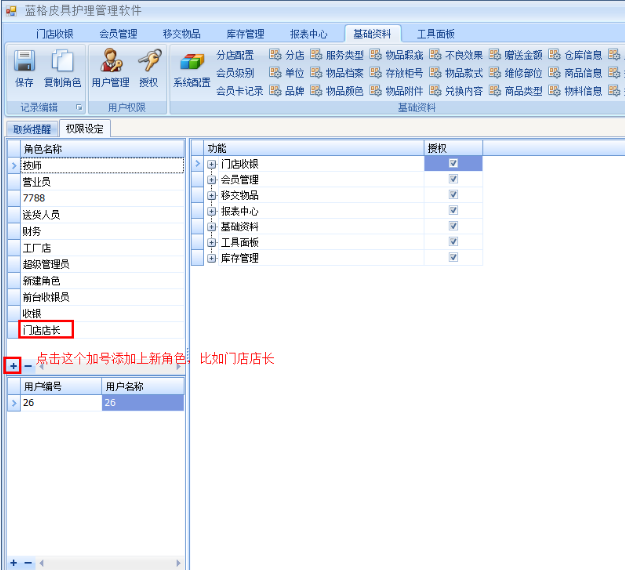 2、點(diǎn)擊角色名稱(chēng)里的加號(hào)添加上門(mén)店員工的角色(員工職位),如下圖所示: