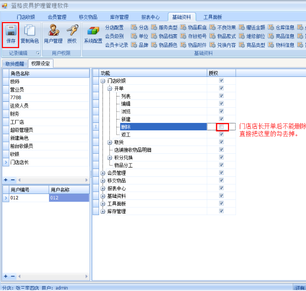 4、在右邊的功能授權(quán)這里選擇相應(yīng)的單據(jù),分配權(quán)限,舉例,門(mén)店店長(zhǎng)不允許開(kāi)單刪除單據(jù),操作如下: