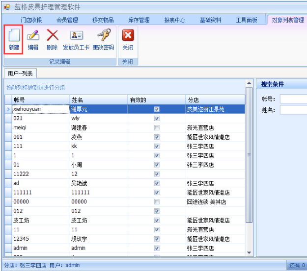 4、界面保存后,退出到傲藍(lán)皮具店連鎖管理軟件用戶列表界面,點擊搜索,就可以看到剛才添加的用戶了。