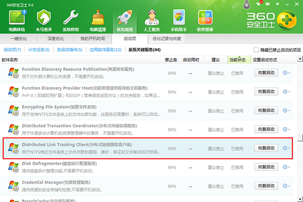 1、電腦安裝了360安全衛(wèi)士,360優(yōu)化加速有一個(gè)分布式鏈接跟蹤客戶端,是用來斷絕外面數(shù)據(jù)的傳入;可以選擇“優(yōu)化加速”中的啟動(dòng)項(xiàng)——接著找到“分布式傳輸協(xié)調(diào)服務(wù)”——主要是看下此項(xiàng)目是否啟動(dòng)。禁用的話就要在右邊點(diǎn)擊“恢復(fù)啟動(dòng)”,“已禁用”,點(diǎn)恢復(fù)啟動(dòng)。這一步完成了還不能完全把問題解決了360一鍵優(yōu)化也會(huì)直接影響到電腦系統(tǒng)里面的分布式協(xié)調(diào)器的運(yùn)行。