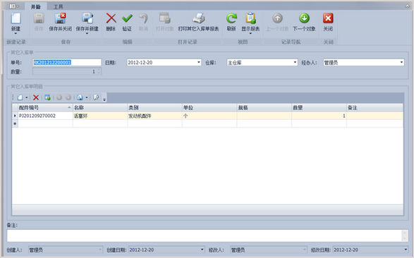 選擇配件之后配件的其它信息會自動帶出,只要填寫完數(shù)量(數(shù)量必須大于0)即可驗證通過保存。
