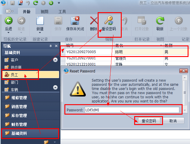 如何查看一個用戶的密碼呢?答案是無法查看,即使是管理員也無法查看。如果您屬下的某個員工忘記了密碼了,那么您可以用您的管理員賬號登陸系統(tǒng),并且在“基礎(chǔ)資料”-“員工”中找到并選中該員工,點擊工具欄的“重設(shè)密碼”按鈕,在彈出的重設(shè)密碼窗口中輸入新的密碼即可,您也可以先為他設(shè)定簡單的密碼,然后讓他登陸后自行重設(shè)密碼。
