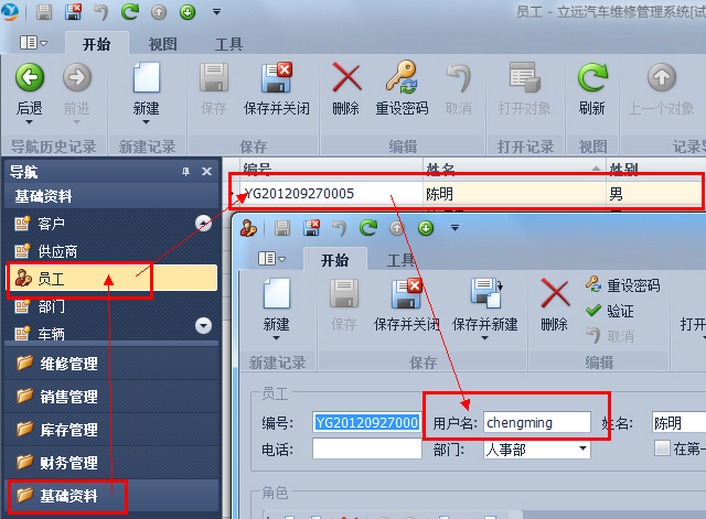 用戶名和密碼是登錄到傲藍(lán)汽車維修管理系統(tǒng)的兩把鑰匙,用戶名可以在“基礎(chǔ)資料”-“員工”,雙擊其中一個員工后,在“用戶名”字段中查看得到。