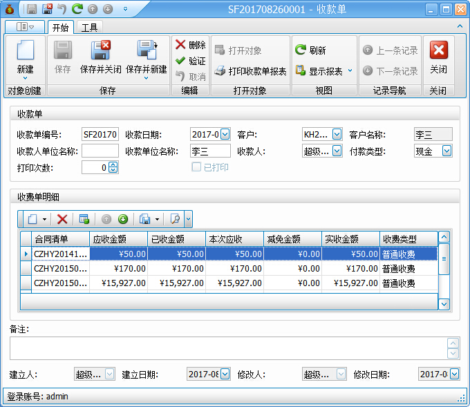 舞臺租賃軟件結(jié)算管理-收款單的具體屬性包括:編號、收款日期、客戶、收款人單位名稱、付款人單位名稱、收款人、付款類型、備注、收費單明細(xì)等屬性。