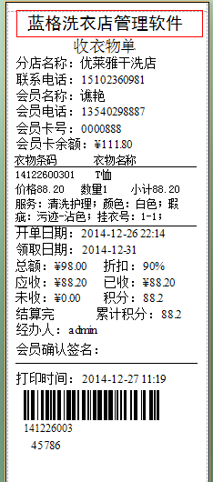 剛剛開始用傲藍(lán)洗衣店管理軟件,把店鋪的資料都填好了,為什么打印小票是還是會(huì)出現(xiàn)傲藍(lán)洗衣店管理軟件的,這個(gè)可以改成店鋪的名稱嗎?如下: